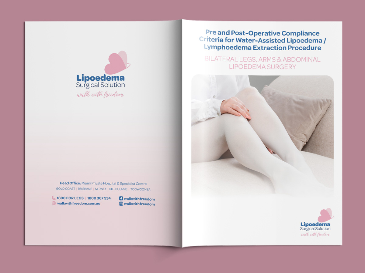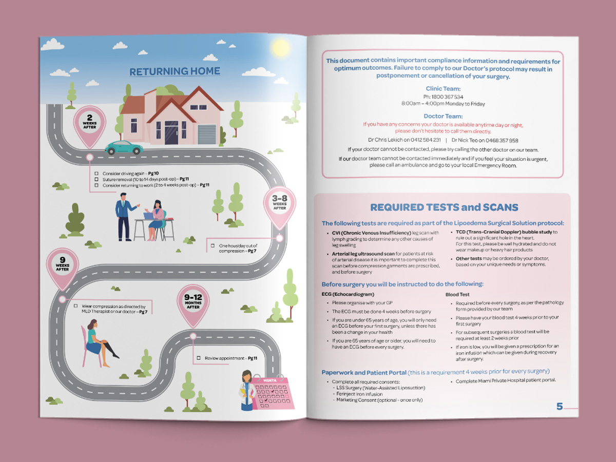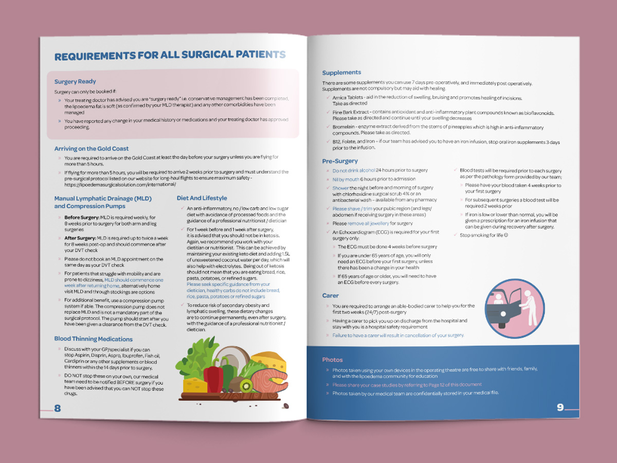 Pre and Post Surgery Instructions Brochure – Lipoedema Surgical Solution CLIENT: Lipoedema Surgical Solution A4 sized 16-page Pre & Post Instructions Brochure for patients, including custom illustrations. Are you ready to invest in your brand's success? YES, I'M READY!