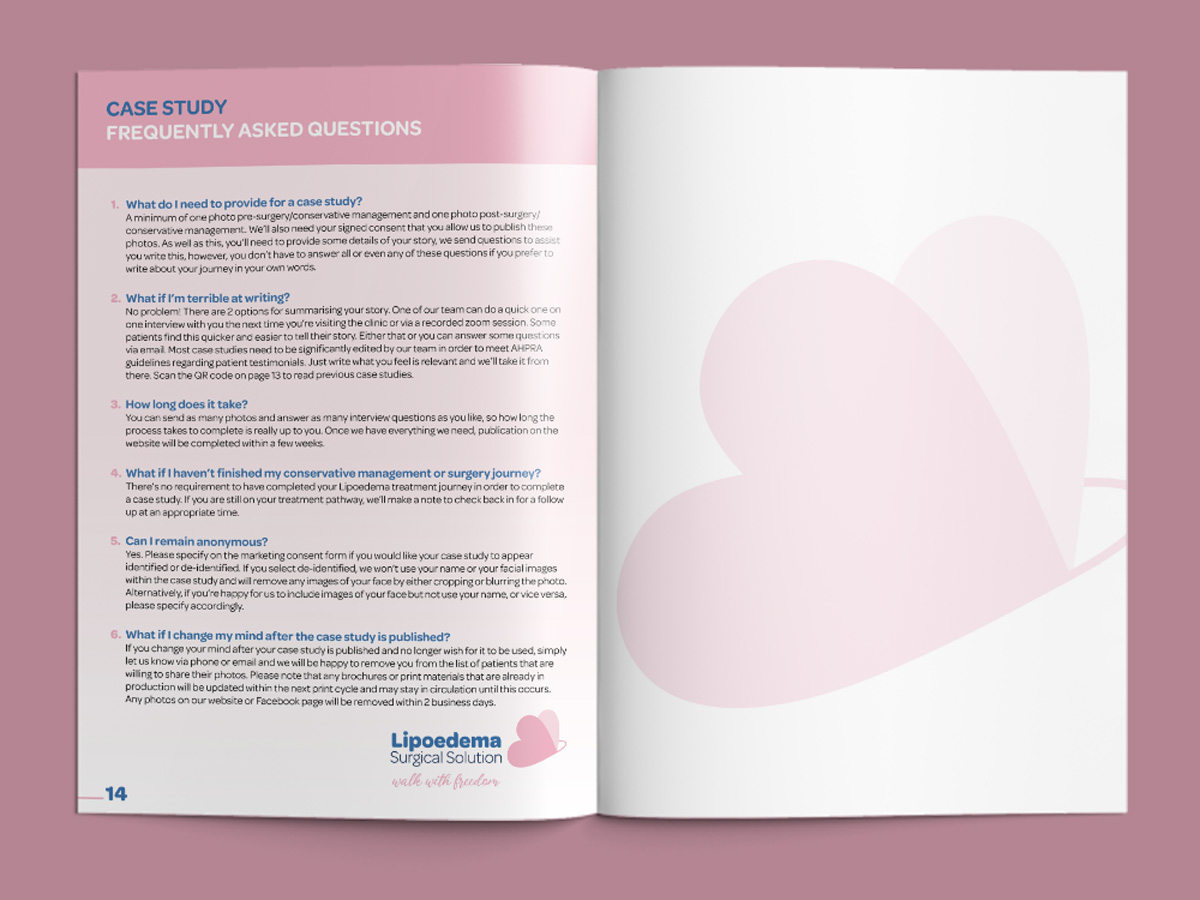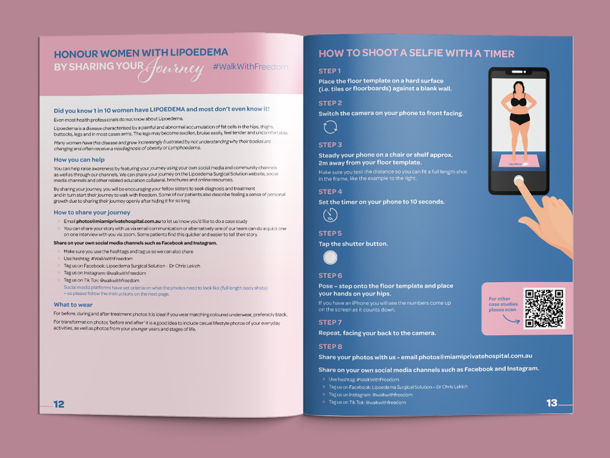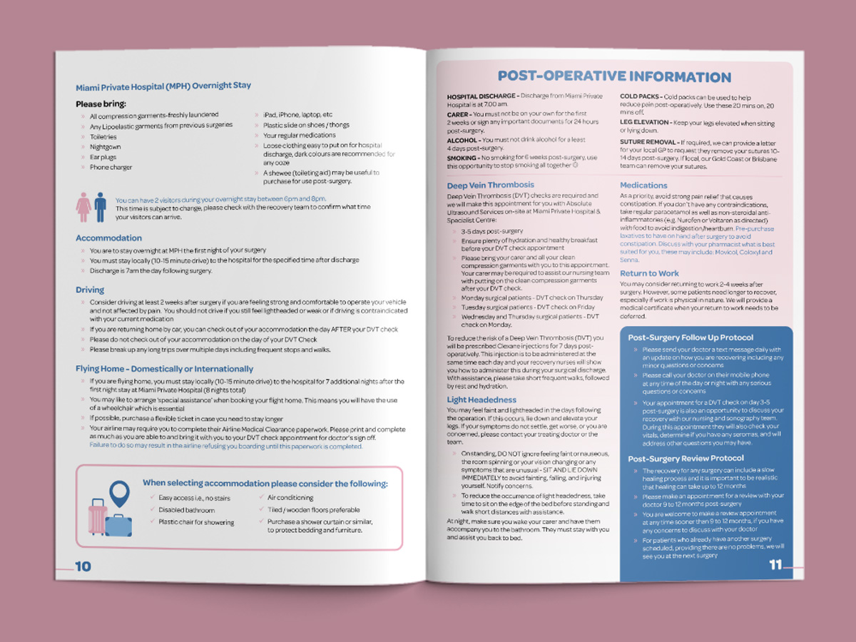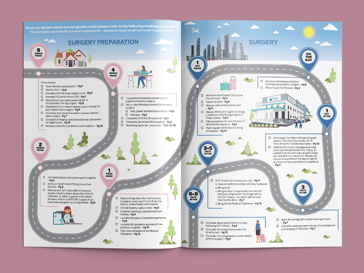 Pre and Post Surgery Instructions Brochure – Lipoedema Surgical Solution CLIENT: Lipoedema Surgical Solution A4 sized 16-page Pre & Post Instructions Brochure for patients, including custom illustrations. Are you ready to invest in your brand's success? YES, I'M READY!
